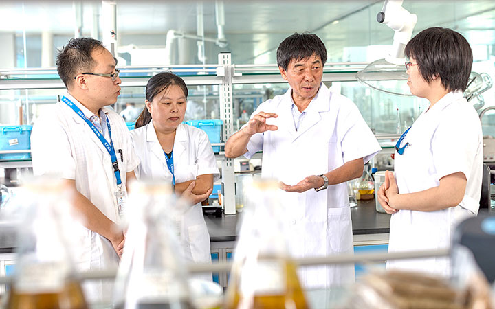 晨光生物董事長兼總經(jīng)理盧慶國(右二)與黨員、技術(shù)骨干奮戰(zhàn)在科技創(chuàng)新一線。